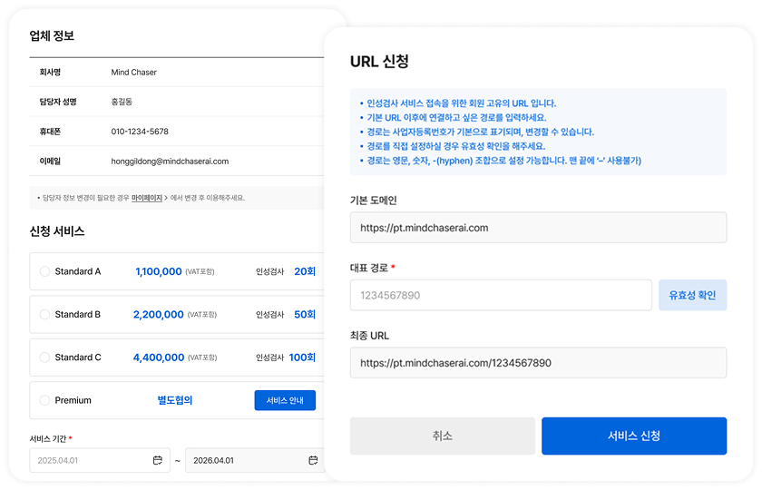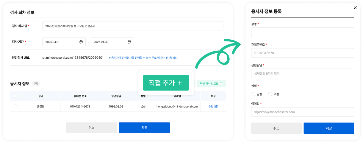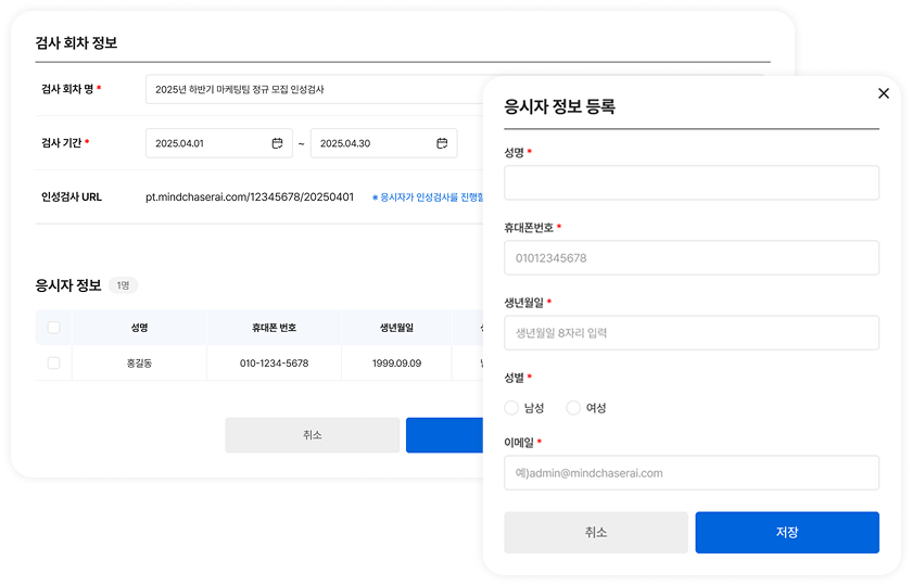 인성검사 서비스를 위한 정보 등록과 응시자 전용 URL 제공
